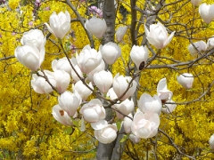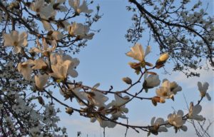 春の灯がともったような白木蓮も街路樹や庭木として目を楽しませます。木蓮の花は上を向いて咲き、辛夷と比べればいずれも花びらが厚く、長さは十cmくらいになります。木の高さは十五mにも伸び、散歩道で白木蓮の小舟のような形の花びらが落ちているのをみつけると、どこから舞い降りたのだろうと思わずあたりを見上げます。